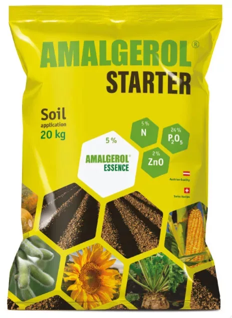 Az Amalgerol Starter (4% N; 24% P205; 2% K20; 1,25% S; 2% Zn; 5% Amalgerol Essence) különlegessége, hogy 5%-os keverék arányban tartalmazza az Amalgerol Essence mikrogranulált formulációját, amely hígítatlanul 100%-ban van jelen a termékben elősegítve a talaj mikrobiológiai életét, a tápanyag feltáródást és ezáltal a növény fejlődését. Különleges tulajdonsága, hogy a növények biokémiai folyamataihoz nélkülözhetetlen esszenciális aminosavakat tartalmaz. Ennek köszönhetően a növénynek nem kell külön energiát, tápanyagot, vizet mozgósítania az előállításukhoz, ezért az így megmaradt energia a növények ellenálló képességének, termés mennyiségének és minőségének növelésére fordítódik. Az Amalgerol Starter-ben a tápelemeket tartalmazó mikrogranulált műtrágya mellett fajsúly egalizálással (homogenitás) az Amalgerol Essence mikrogranulált formulációja van jelen a 20 kg-os kiszerelésben.