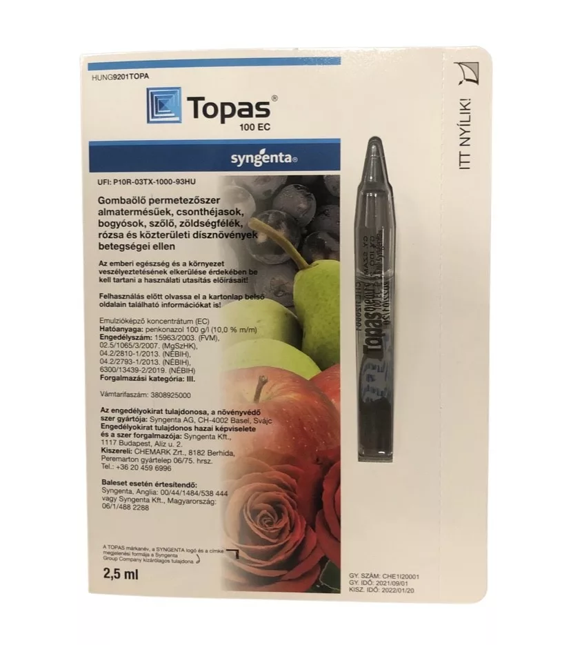 Topas 100 EC Lisztharmat elleni felszívódó készítmény almában, szőlőben, csonthéjasokban, zöldségekben Hatóanyag: 10% penkonazol.